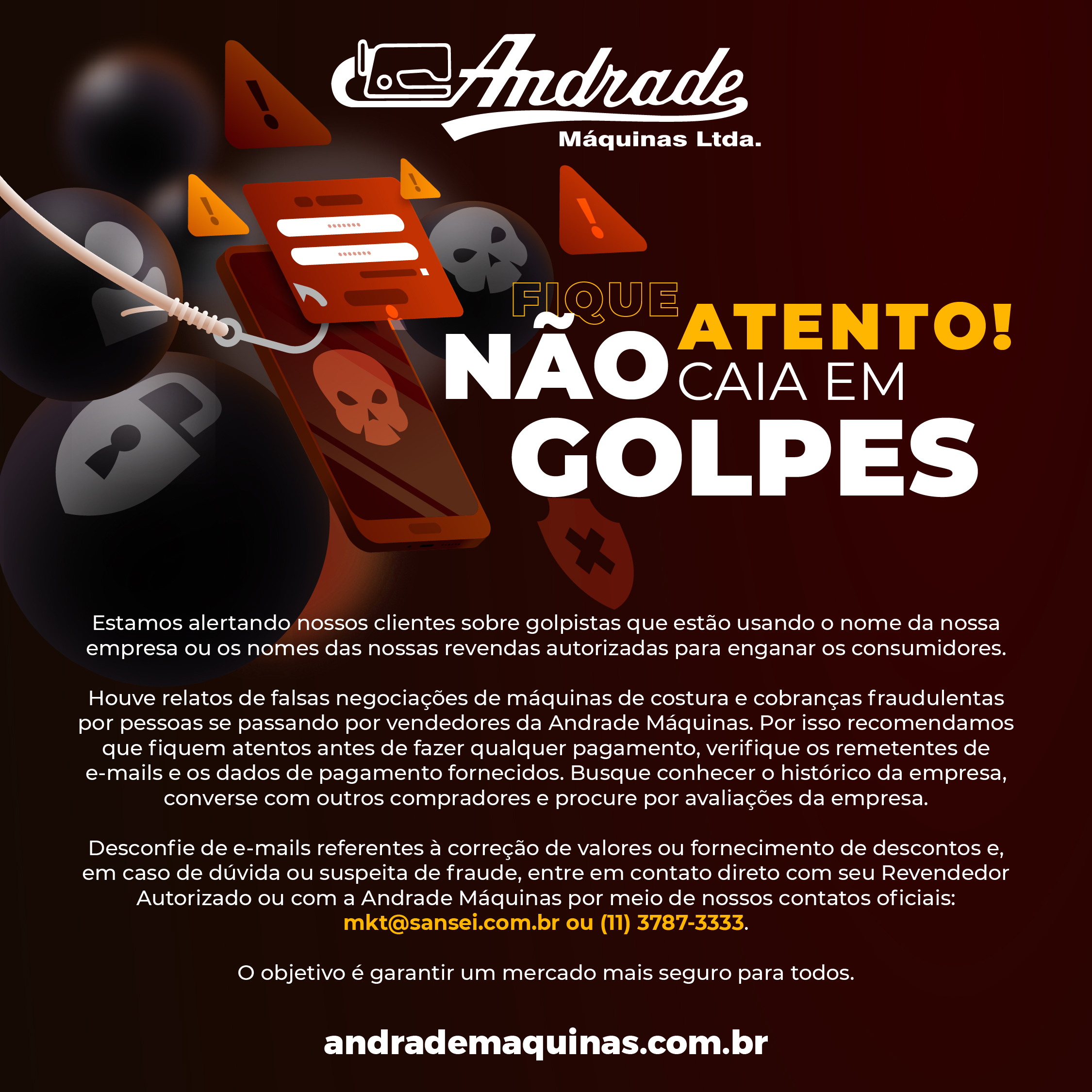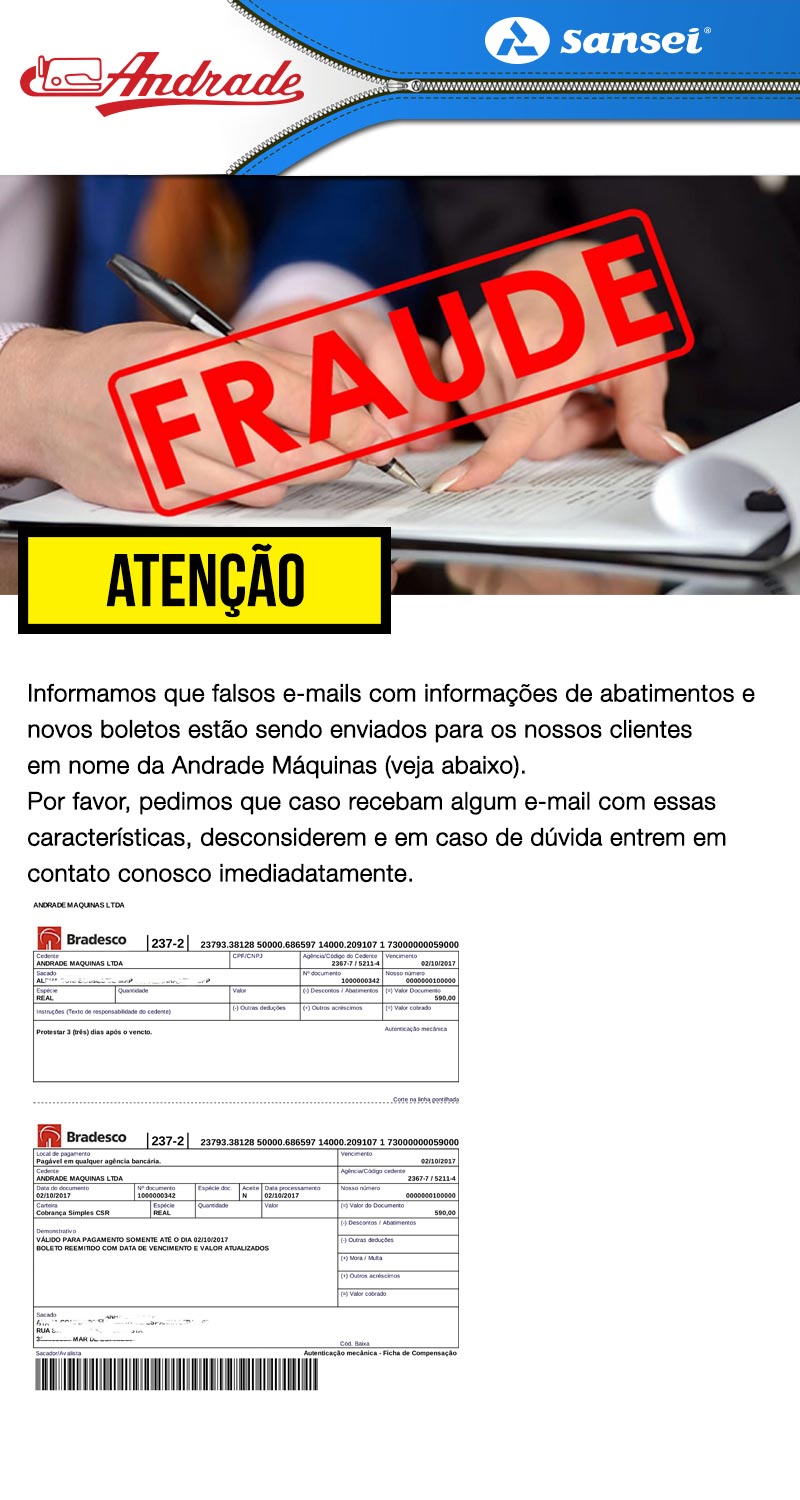 Houve relatos de falsas negociações de máquinas de costura e cobranças fraudulentas por pessoas se passando por vendedores da Andrade Máquinas. Por isso recomendamos que fiquem atentos antes de fazer qualquer pagamento, verifique os remetentes de e-mails e os dados de pagamento fornecidos. Busque conhecer o histórico da empresa, converse com outros compradores e procure por avaliações da empresa.