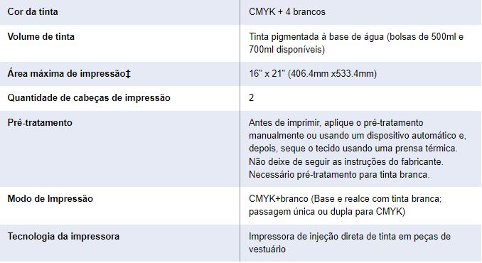 Tintas Têxteis Innobella, com cores mais brilhantes. Tintas não prejudiciais ao meio ambiente. Interface simples e fácil de usar, com visualização de imagem, para operação fácil de usar. Sensores de altura de de duplo feixe: garante a altura da prancha para uma ótima e a impressão nítida. Grande variedade de bastidores opcionais, para imprimir em diversos elementos, como tenis, boné, roupas com zíper, camisas, jeans, mangas e muito mais.